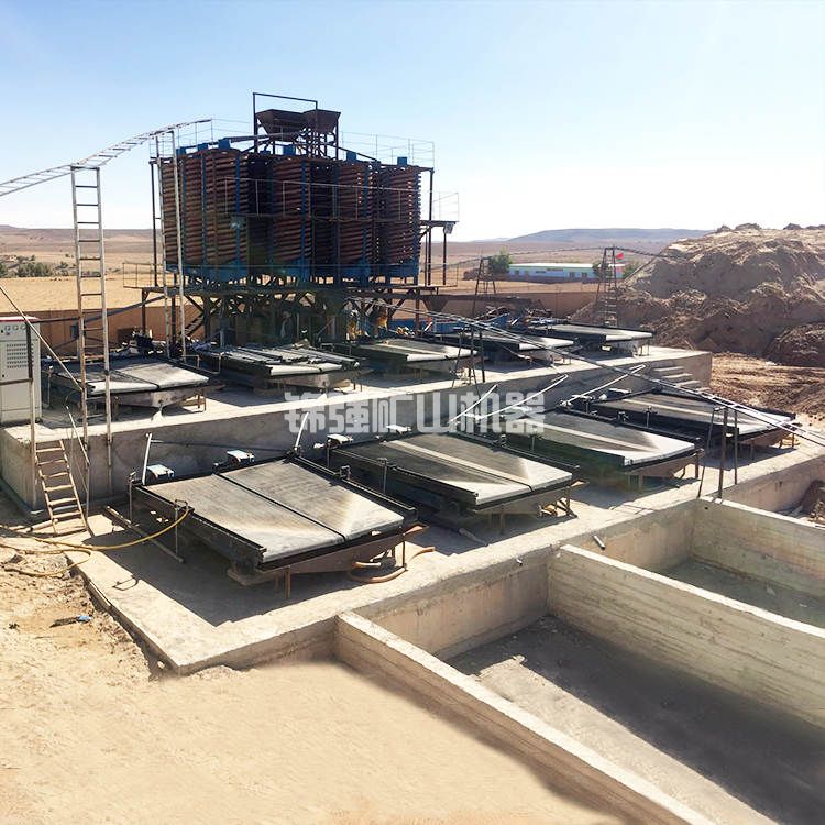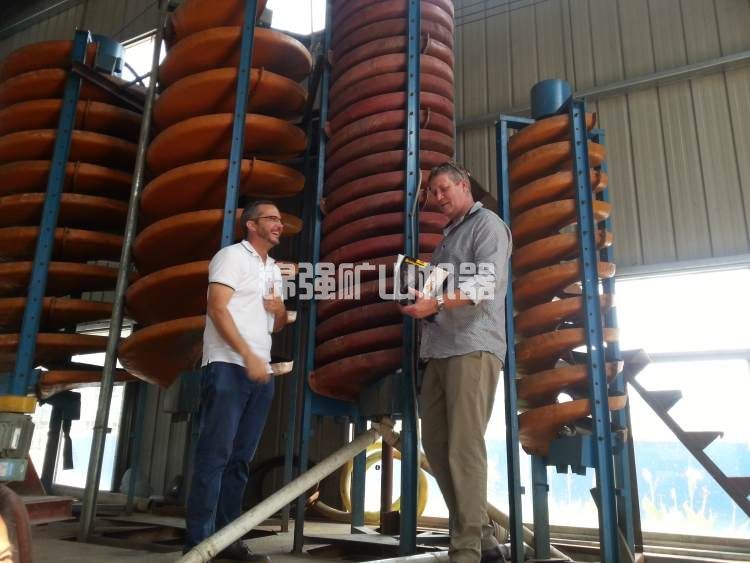 將玻璃鋼螺旋溜槽立起,校正等分線,用鐵架子或木材固定不動在適合的部位,由泥沙泵將石砂送至螺旋式上頂2個入料出口處,添加填補水,調整礦槳濃度值,礦槳當然從高向下漩流,在轉動的斜坡水流量中造成一種慣性力的向心力,以石砂的比例、粒度分布、樣子上的差別,根據漩流的作用力和向心力的功效,將礦與砂分離,鈦精礦注入鈦精礦斗用管路串接,工業廢渣流到工業廢渣斗用管路收到砂池,再用泥沙泵排出去,完成了選礦廠的整個過程。