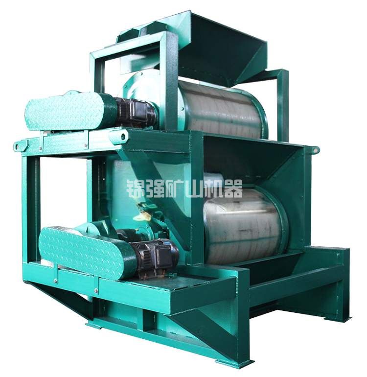 含有磁性物質的非磁性物料經過電磁振動給料機均勻的分布到強磁雙輥干式磁選機皮帶上;當物料通過強磁輥時,磁性物質由于受磁力的吸附作用被吸附到強磁輥上,被皮帶帶入磁性物料集料斗中;非磁性物料及未被選凈的磁性物料隨著皮帶的轉動受重力作用,脫離磁場并下落到下一層皮帶上繼續選別;這樣,經過幾道磁選之后就能選別出合格產品。